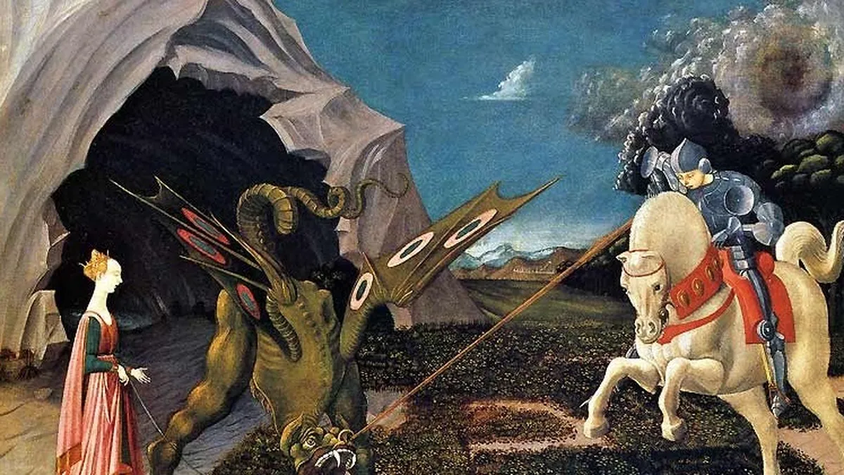 Cuentan que en un lugar (casi nunca se dice en cual, o se dan nombres distintos), habitaba un dragón, que tenía atemorizados a todos los habitantes. Cada día echaban a suertes a ver a quien le tocaba ser devorado por el monstruo, pues esa era la única forma de apaciguar su ferocidad. Un día le tocó a la hija del rey. Éste no quería dejarla marchar, pero ella se escapó y se fue en busca del dragón. Cuando estaba a punto de devorarla, apareció un respetable señor armado a caballo y con su espada mató al dragón, salvando de esta manera a la inocente doncella y a todo un pueblo. Por eso la imagen que más ha proliferado de San Jorge es la del caballero matando al dragón. El suceso, según varios autores, hay que interpretarlo de forma simbólica y lo que con él se nos quiere trasmitir es el mensaje del triunfo del cristianismo sobre el paganismo que tantos estragos supuso para los seguidores de Cristo. Basándose en esta leyenda Valle Inclán escribió la farsa infantil teatralizada, titulada “La cabeza del Dragón”