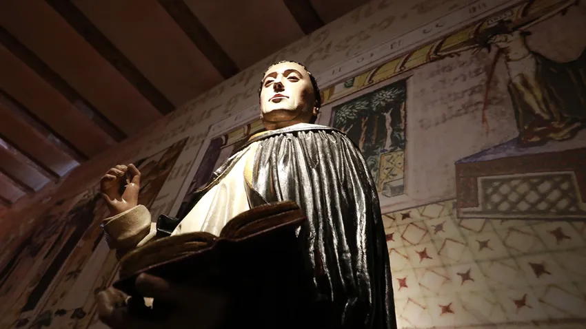 Corría el siglo XII, las guerras entre moros y cristianos se habían convertido en algo habitual, por lo que pueblos y ciudades de un bando u otro eran arrasadas y saqueadas; hoy tocaba avanzar a los cristianos y mañana a los moros, en unos tiempos de hambre y de miseria en que los pordioseros y menesterosos se contaban por cientos y a Domingo, que había heredado ese espíritu generoso de su santa madre Juana, todo se le escapaba de las manos e iba a parar a esos desgraciados que le asediaban por la calle, a quienes les daba hasta la camisa y no contento con ello, un día que no tenía nada que dar, echó mano de los libros, preciado tesoro en aquellos tiempos, los empeñó para obtener algo de dinero y así poder repartir entre los más necesitados unas monedillas y cuando alguien le reprochaba este gesto, se defendía diciendo: “yo no puedo conservar para mí pieles muertas, cuando veo hermanos vivos que se están muriendo de hambre”. Tiempos éstos eran también en que corría serio peligro la fe de sus mayores y la que él mismo profesaba. Su venida a este mundo estuvo presidida por sueños y premoniciones, en las que él simbólicamente aparecía como un cachorro que llevaba en su boca una tea encendida para iluminar a un mundo, que se sentía amenazado por la ceguera y oscuridad.