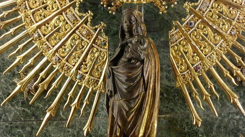 La Virgen, que permanecía aún en Tierra Santa, se le va a hacer presente posándose sobre una columna de mármol que se conserva en el interior de la basílica zaragozana para consolarle y darle ánimos. De ser así, ésta habría sido la primera aparición mariana de toda la historia. De la Virgen habría recibido la petición de construir una capilla en su honor con la promesa de que mientras ese pilar se mantuviera en pie no faltarían cristianos por estas tierras. Santiago, recogió la columna y con los ocho discípulos que le acompañaban más la ayuda de los conversos, se puso a edificar la capillita que llevaría por nombre Santa María del Pilar, también esta construcción habría de ser la primera iglesia mariana sobre la que se levantaría la monumental basílica que se yergue airosa sobre los limpios cielos de Zaragoza.