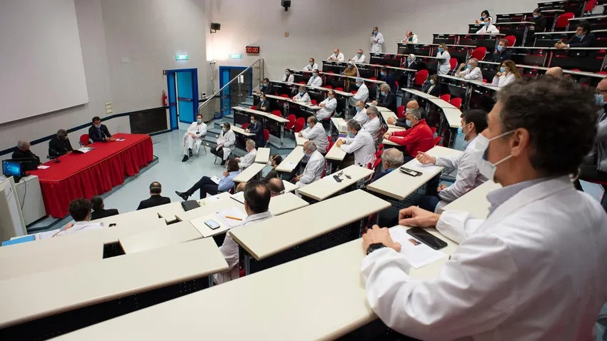 Hoy pudimos realizar esta visita al Gemelli, donde todos los días a las 14.30 horas los médicos que atienden a los pacientes afectados por Covid-19 se reúnen para hacer un balance de la experiencia del día. Hemos sido invitados hoy a participar en esta reunión para llevarles un saludo.