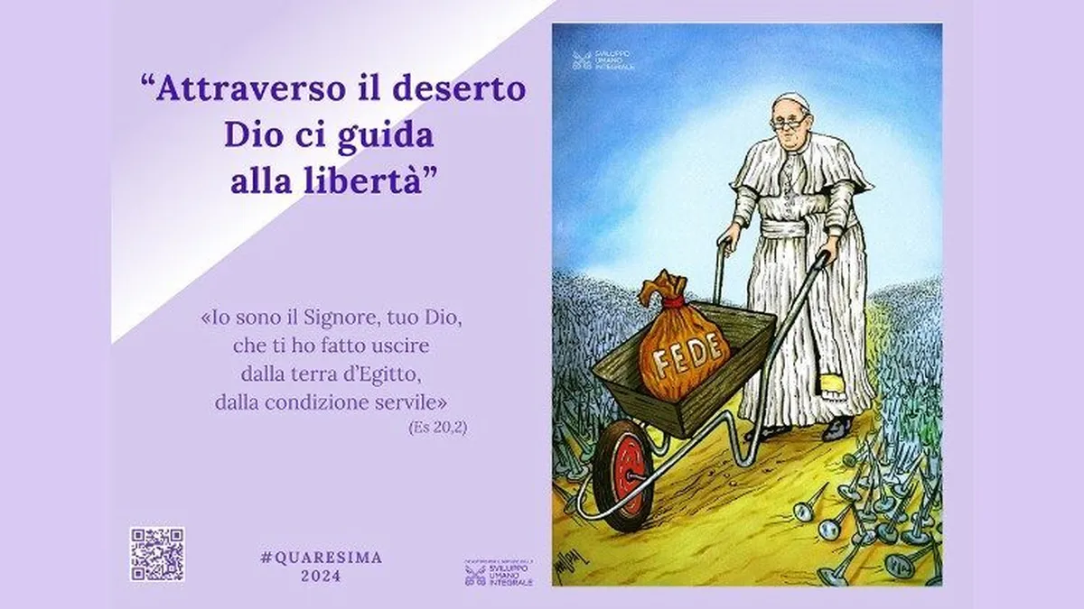 "A través del desierto Dios nos guía hacia la libertad", este es el título del Mensaje del Papa Francisco para la Cuaresma 2024, presentado esta mañana en la Sala de Prensa del Vaticano con el Cardenal Michael Czerny, Prefecto del Dicasterio para el Servicio del Desarrollo Humano Integral, en la mesa de oradores, de Emilia Palladino, licenciada en Física y profesora extraordinaria en la Pontificia Universidad Gregoriana, de don Andrea Cavallini, que en la diócesis de Roma se ocupa de la formación de catequistas y de itinerarios catequéticos, y del artista Mauro Pallotta, conocido como "Maupal".