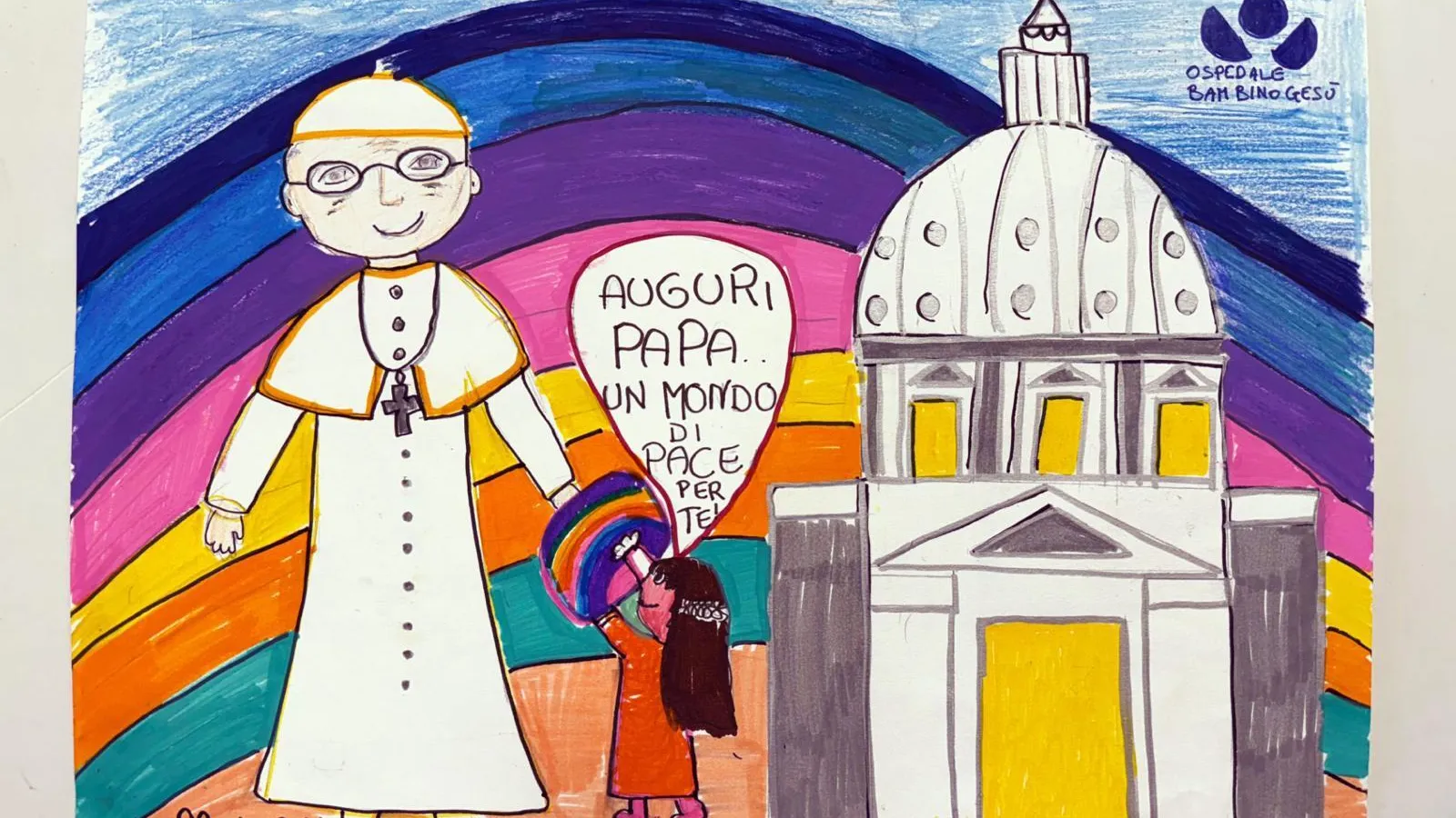 Con la confianza de que el Papa sea la persona adecuada para encontrar las vías del diálogo, en un dibujo se representa a León XIV diciendo «Tranquilos, yo me encargo» mientras ondea la bandera de la paz, entre una paloma con una rama de olivo y la basílica de San Pedro coloreada en blanco y amarillo, como la bandera del Vaticano, le dibujan lo sniños del Bambino Gesú