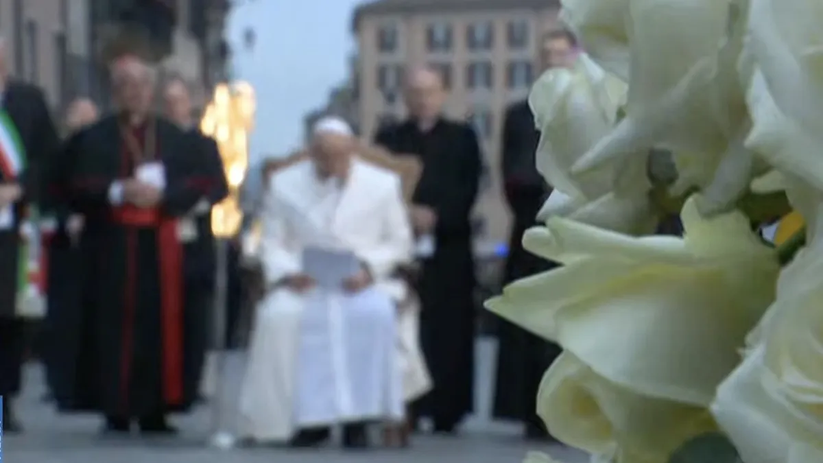 Francisco, sentado en un sillón y ataviado con un abrigo blanco, pidió la intercesión de la Virgen por las familias, los centros de estudio y trabajo, las instituciones públicas, los hospitales y residencias, las cárceles o los sin techo.