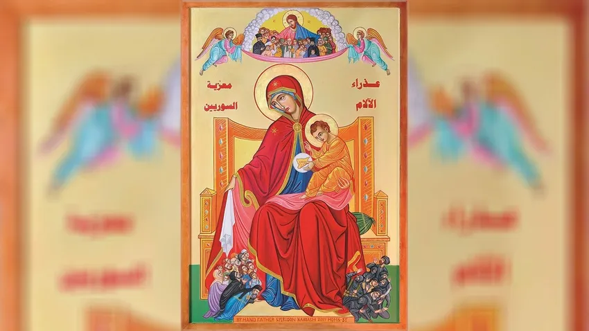 Francisco bendice el icono de la Virgen de los Dolores, consoladora de los sirios