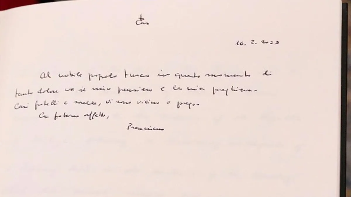 "Al noble pueblo turco, en este momento de tanto dolor, va mi pensamiento y mi oración. Queridos hermanos y hermanas, estoy cerca de ustedes y rezo. Con afecto fraterno, Franciscus", dice la nota manuscrita