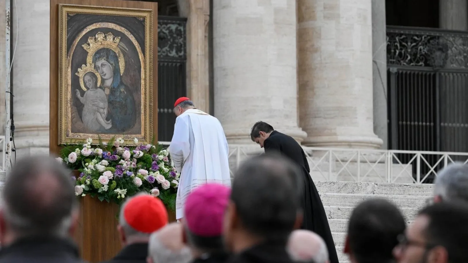 Ante la imagen de María Mater Ecclesiae colocada en la plaza exterior de la Basílica de San Pedro y adornada con un ramo de flores blancas y rosas, el cardenal Gambetti dirigió la oración mariana para encomendar al difunto 266º Sucesor de Pedro a la intercesión de la Virgen. Gran emoción hubo en la plaza, después de una intensa jornada que vio a fieles de diversas partes del mundo peregrinar a la Basílica Vaticana y quedar atónitos, consternados por la noticia de la muerte del obispo de Roma. La brisa de la tarde mecía suavemente las cuentas del rosario y las llamas de las antorchas que portaban los fieles. Entre los lectores que se turnaron al micrófono estaban sor Raffaella Petrini, presidenta de la Gobernación del Estado de la Ciudad del Vaticano, y sor Alessandra Smerilli, secretaria del Dicasterio para el Servicio del Desarrollo Humano Integral.