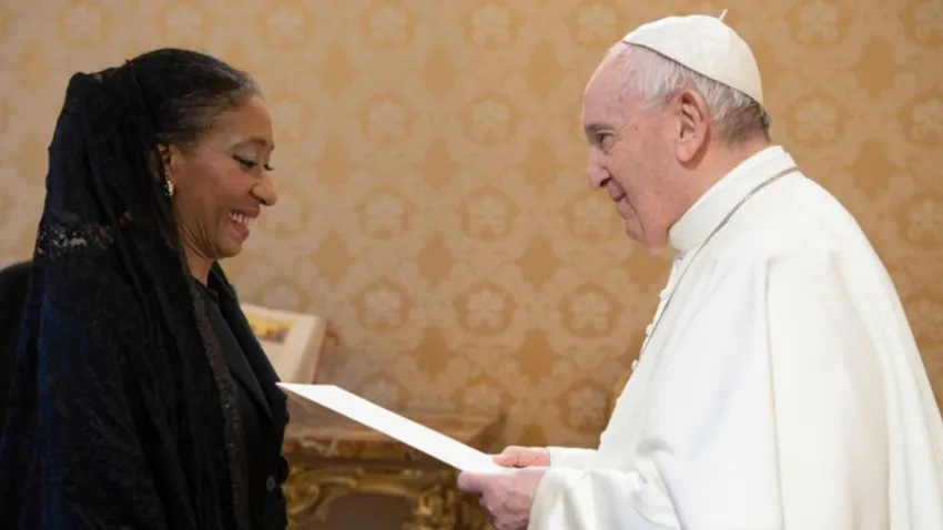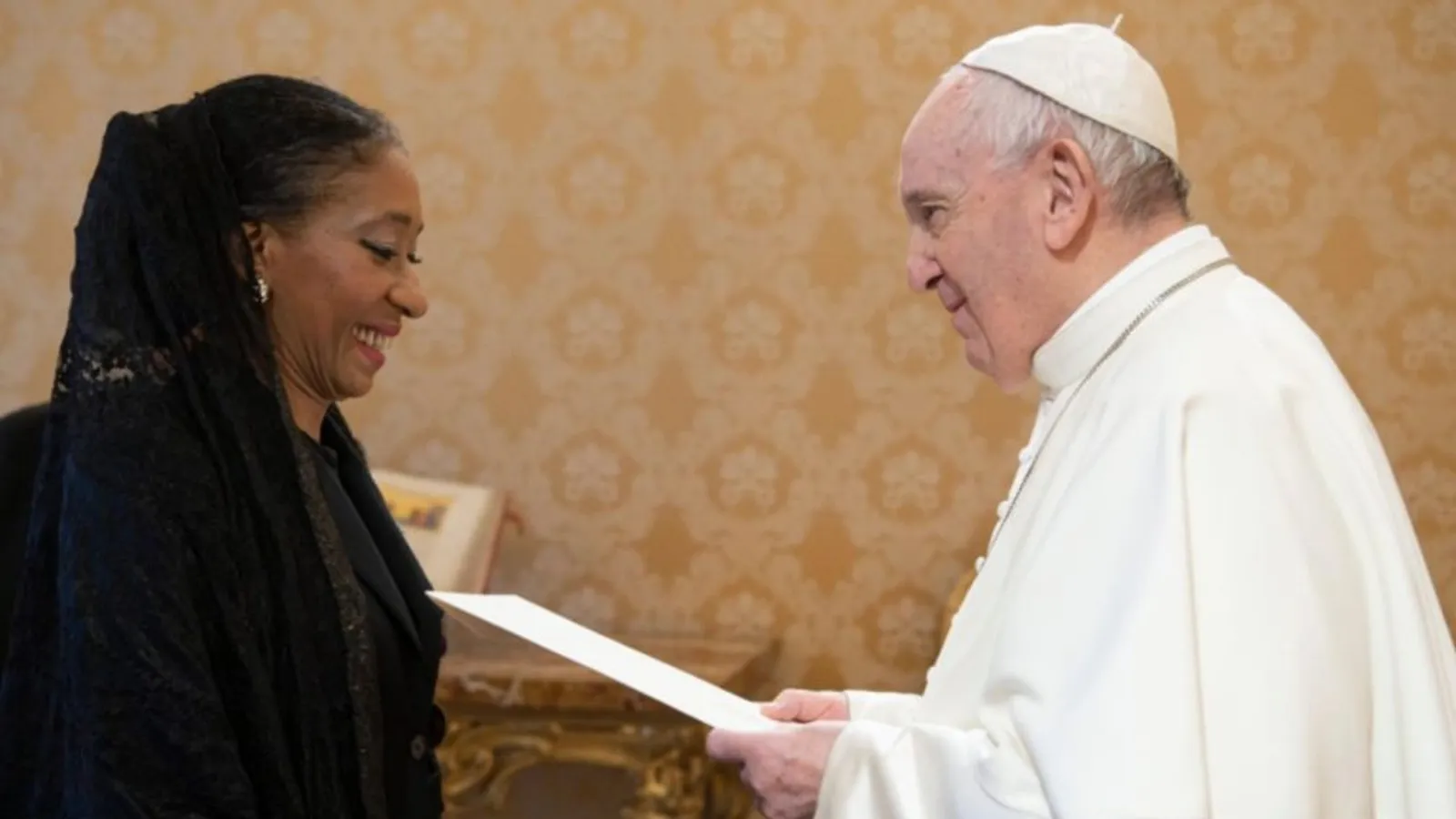 La presentación de cartas credenciales empezó en realidad con una oración que el Papa quiso compartir con Silva y el personal diplomático de la embajada. Luego, el pontífice miró a Silva y, entre risas, les dijo: "ahora me voy con ella a arreglar el mundo".