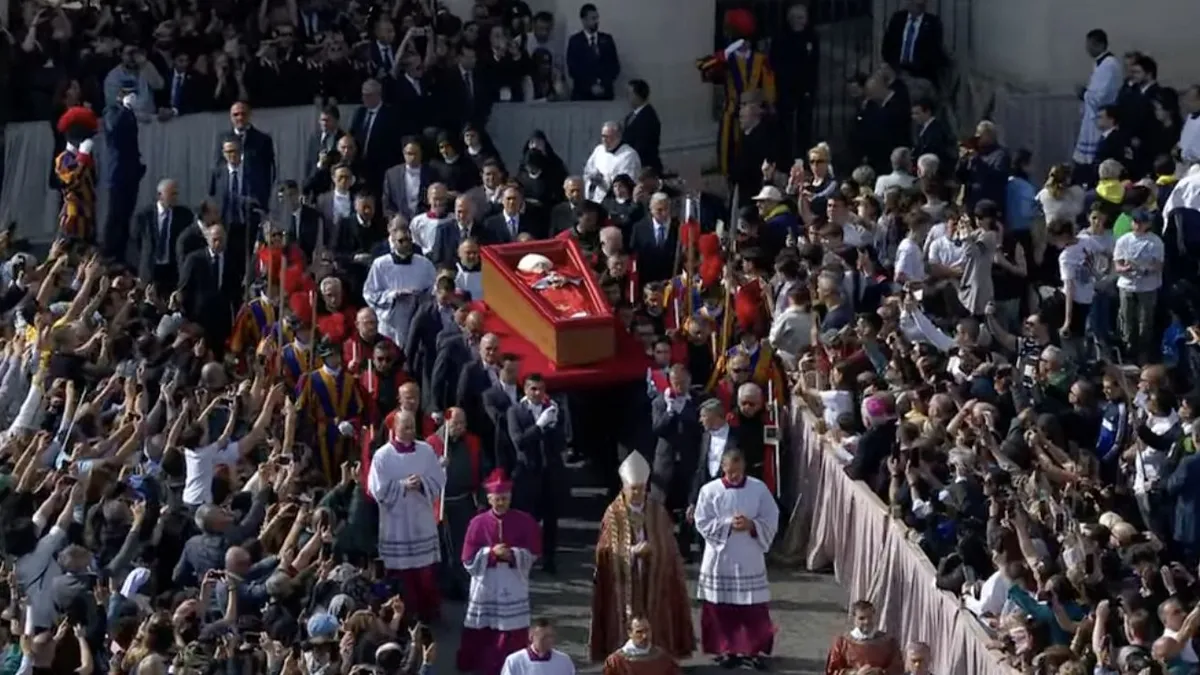 Una solemne procesión, encabezada por el cardenal camarlengo y el ceremoniero, recorrió el breve espacio entre la Casa Santa Marta y la basílica a la que accedieron por la nave central, permitiendo que el cuerpo de Francisco volviera a recorrer sus últimos pasos en vida. Decenas de miles de fieles contemplaban la escena, esperando para poder entrar en el templo para despedir a su Papa. En un silencio absoluto, solo roto con aplausos cuando Francisco rodeó la plaza antes de entrar en el templo.