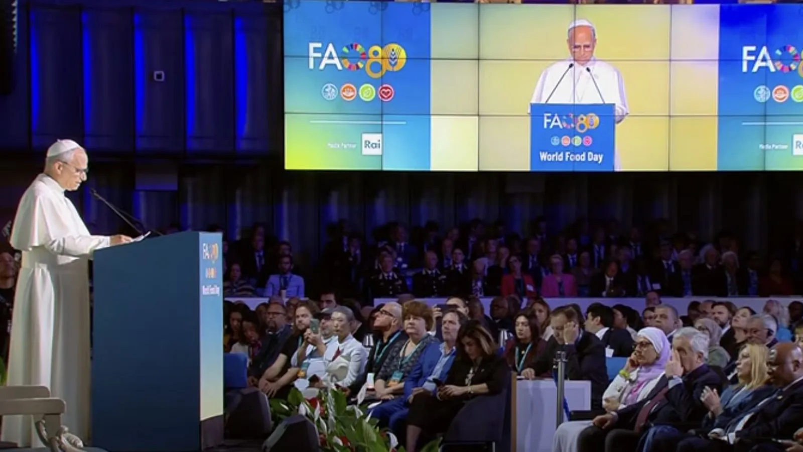 "A ochenta años de la institución de la FAO, nuestra conciencia debe interpelarnos una vez más frente al drama —siempre actual— del hambre y la malnutrición. Poner fin a estos males incumbe no sólo a empresarios, funcionarios o responsables políticos. Es un problema a cuya solución todos debemos concurrir", prosiguió Robert F. Prevost, indicando que "el mundo no puede seguir asistiendo a espectáculos tan macabros como los que están en curso en numerosas regiones de la tierra. Hay que darlos por zanjados cuanto antes", en alusión a los conflictos abiertos en el mundo, entre los que citó los de Ucrania, Gaza, Haití, Afganistán, Malí, República Centroafricana, Yemen y Sudán del Sur.