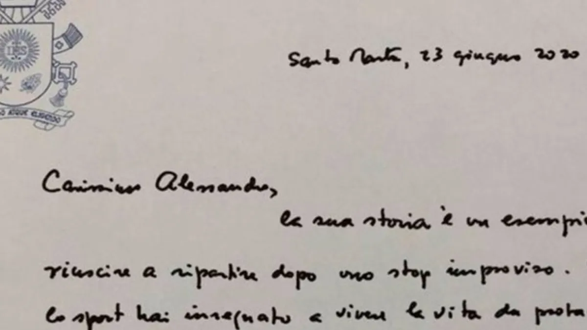 "Querido Alessandro, su historia es un ejemplo de cómo volver a comenzar después de una parada repentina. A través del deporte, enseñó a vivir la vida como protagonista, haciendo de la discapacidad una lección de humanidad. Usted es un atleta, un hombre y un paciente que vale la pena cuidar", comienza la carta escrita por el Papa, publicada por el diario italiano La Gazzetta dello Sport.