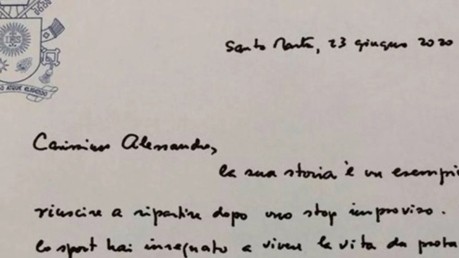 "Querido Alessandro, su historia es un ejemplo de cómo volver a comenzar", dice el mensaje. "A través del deporte, enseñó a vivir la vida como protagonista"