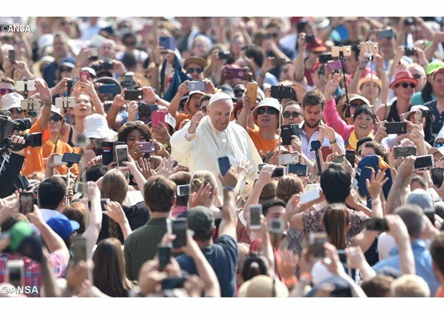 Hoy hacemos esta Audiencia en dos sitios, unidos a través de las pantallas gigantes: los enfermos están en el Aula pablo VI para que no sufran tanto el calor, y nosotros aquí. Pero todos juntos. Y nos une el Espíritu Santo, que es el que hace siempre la unidad. Saludemos a los que están en el Aula...