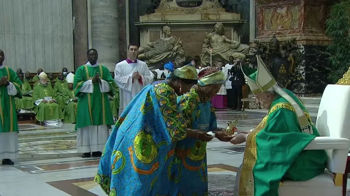 Los cantos zaireños suenan a gloria en la imponente basílica vaticana, mezclados con los bailes y los gritos tradicionales. La gente se mueve y baila al son de la música del gloria y al ritmo de los tambores. Y ondean las banderas de la RD Congo.