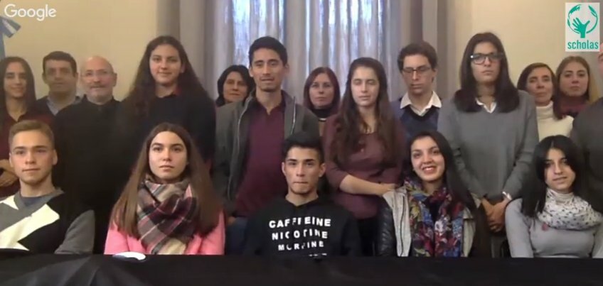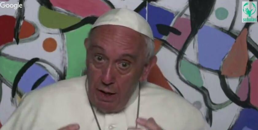 Pocos minutos después de las cinco de la tarde Bergoglio cumplió un sueño, que puso en marcha hace 20 años en Buenos Aires. Hoy, Scholas es el movimiento estudiantil más grande a nivel mundial. En el Palacio de San Calixto, y ante representantes educativos, religiosos y sociales, Bergoglio prestó especial atención a los testimonios, a las "piedritas", que le ofrecían chicos y chicas procedentes de nueve países: Italia, Colombia, Haití, Paraguay, Argentina, Brasil, México, España y los Emiratos Árabes Unidos.