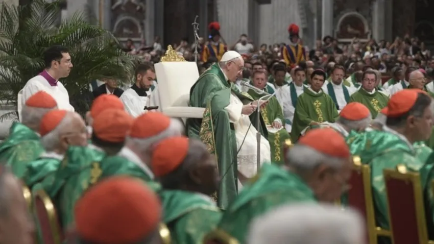 La basílica de San Pedro bañada de color verde de los cardenales y demás concelebrantes. Y, en un lado, la silueta también con capa verde del Papa Francisco, que asiste en su sede. Misa solemne de clausura del consistorio extraordinario, copresidida por el cardenal Re, decano del colegio cardenalicio. El Papa con su Senado intenta mantener la primavera de sus reformas, asociándolos al cambio de estructura eclesial. Para volver al Vaticano II y pasar de la pirámide al círculo o, como a él le gusta decir, al poliedro de una Iglesia sinodal, en la que laicos y mujeres consigan la ansiada paridad.