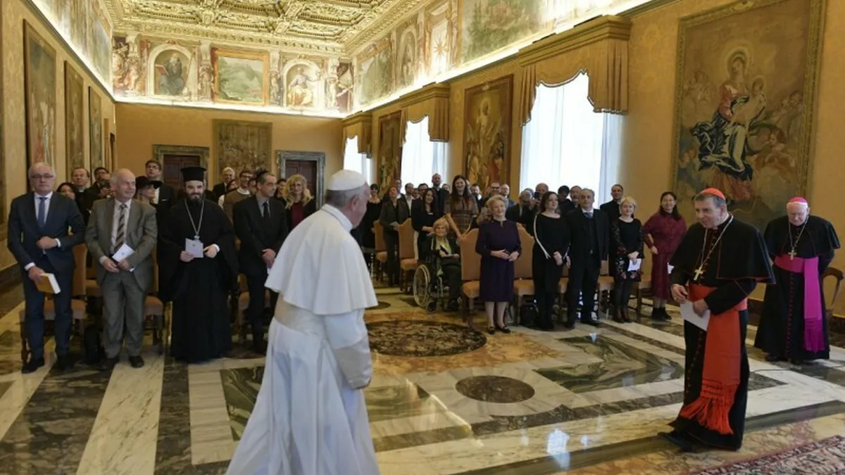 En el 50 aniversario de la muerte del Cardenal Agustín Bea sj, el Papa Francisco se reúne con algunos miembros del Centro de Estudios Judaicos "Cardenal Bea" de la Universidad Gregoriana, así como del Consejo Pontificio para la Promoción de la Unidad de los Cristianos, del Instituto Bíblico Pontificio y el Centro para el Estudio del Cristianismo en la Universidad Hebrea de Jerusalén, en la Sala del Consistorio del Vaticano.