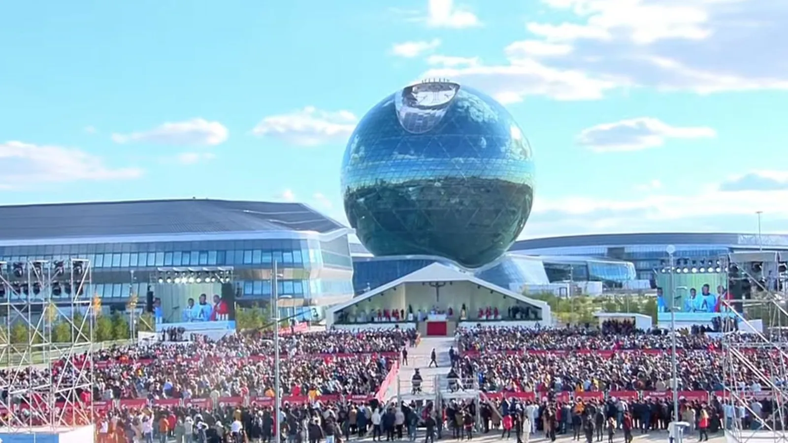 Con este pequeño pero alegre rebaño celebramos la Eucaristía, también en Nursultán, en la plaza de la Expo 2017, rodeada de arquitecturas muy modernas. Era la fiesta de la Santa Cruz. Y esto nos hace reflexionar. En un mundo en el cual progreso y regreso se cruzan, la Cruz de Cristo permanece el ancla de salvación: signo de la esperanza que no decepciona porque está fundada en el amor de Dios, misericordioso y fiel. A Él va nuestro agradecimiento por este viaje, y nuestra oración para que sea rico de frutos para el futuro de Kazajistán y para la vida de la Iglesia peregrina en esa tierra.