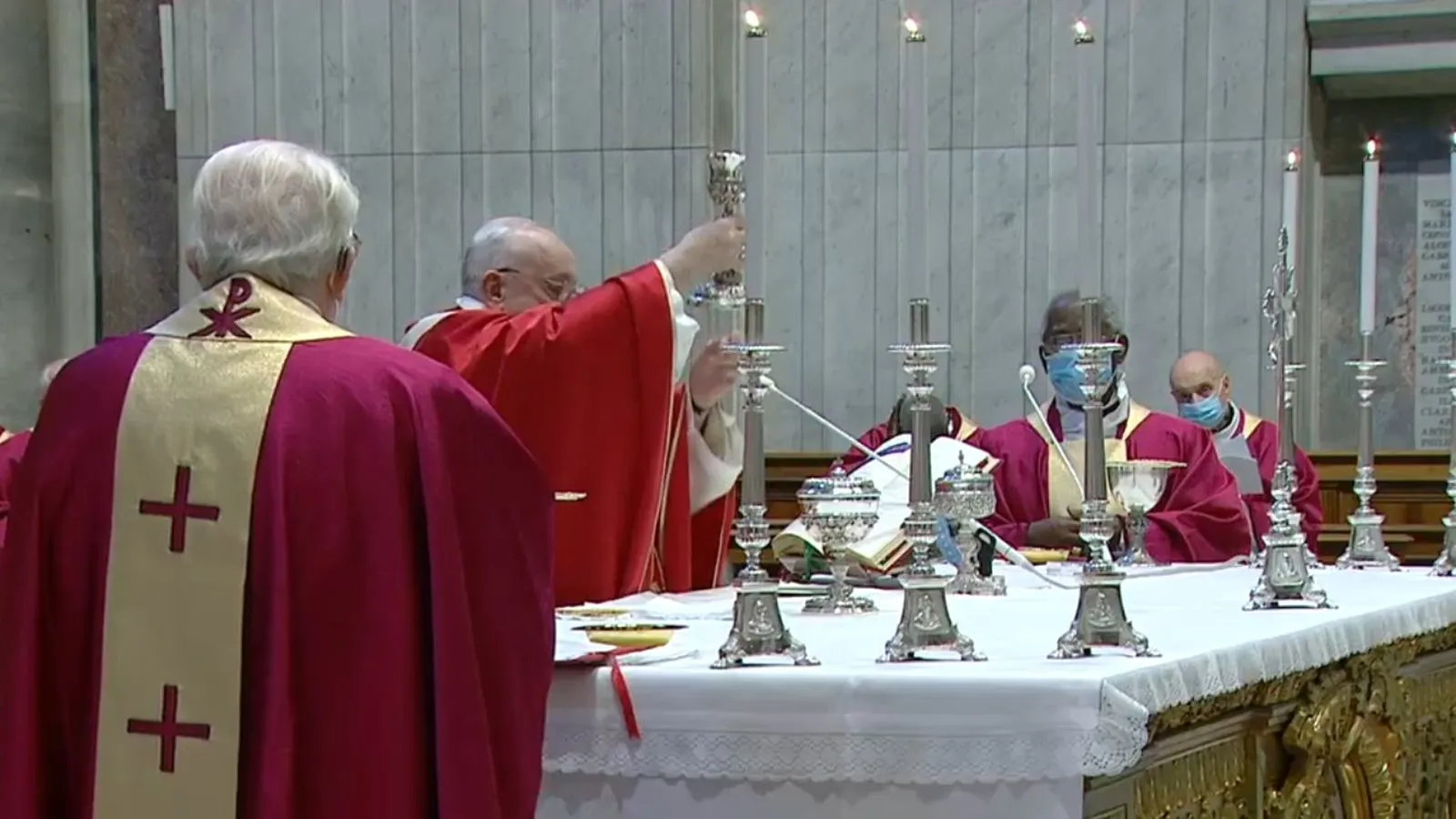 Todos los presentes, incluidos los cardenales concelebrantes y los ceremonieros, llevan la preceptiva mascarilla. Excepto el propio Papa.