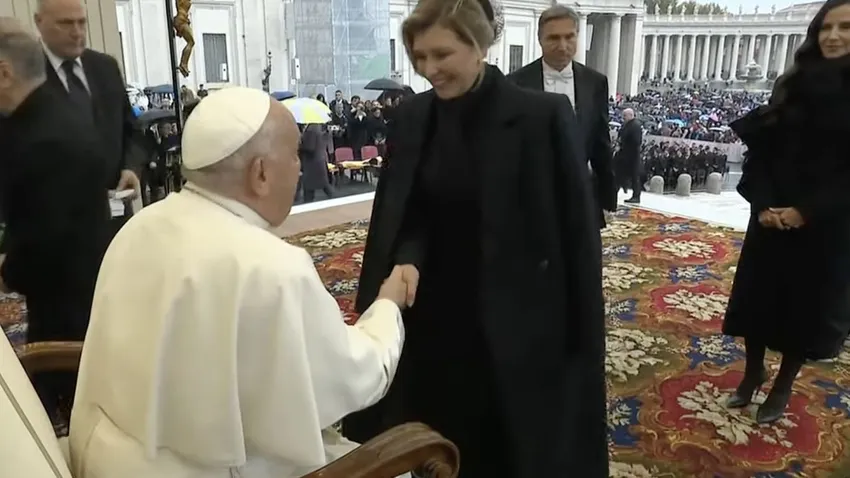 A la hora de los saludos personales, el Papa estrechó la mano de Olena Zelenska, la esposa del presidente de Ucrania, Vlodimir Zelensky, a quien se pudo ver emocionada durante algunos momentos de la audiencia general