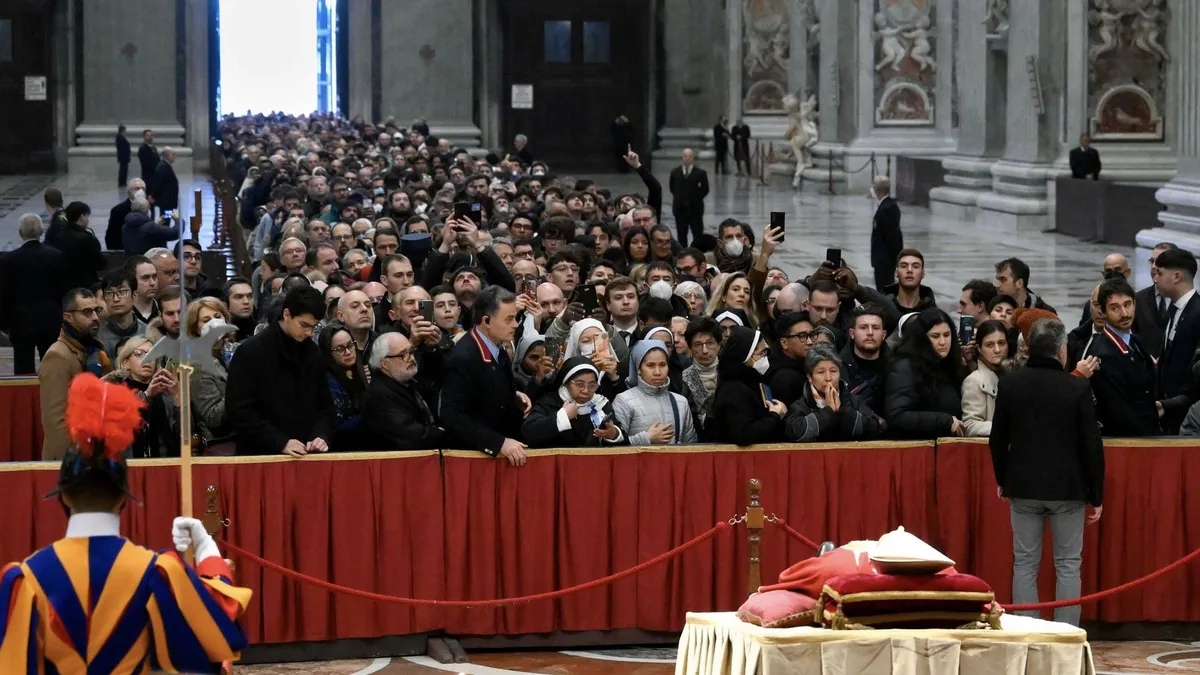 Desde primeras horas de la mañana, ya miles de fieles esperaban a las puertas de la plaza de San Pedro para poder entrar en la basílica vaticana para despedir a Joseph Ratzinger, que en 2013 fue el primer pontífice en renunciar en los últimos seis siglos, y cuyos restos se encuentran sobre un catafalco de tela dorada a los pies del Altar de la Confesión y del baldaquino de Bernini, sobre el lugar en el que según la tradición fue sepultado San Pedro.