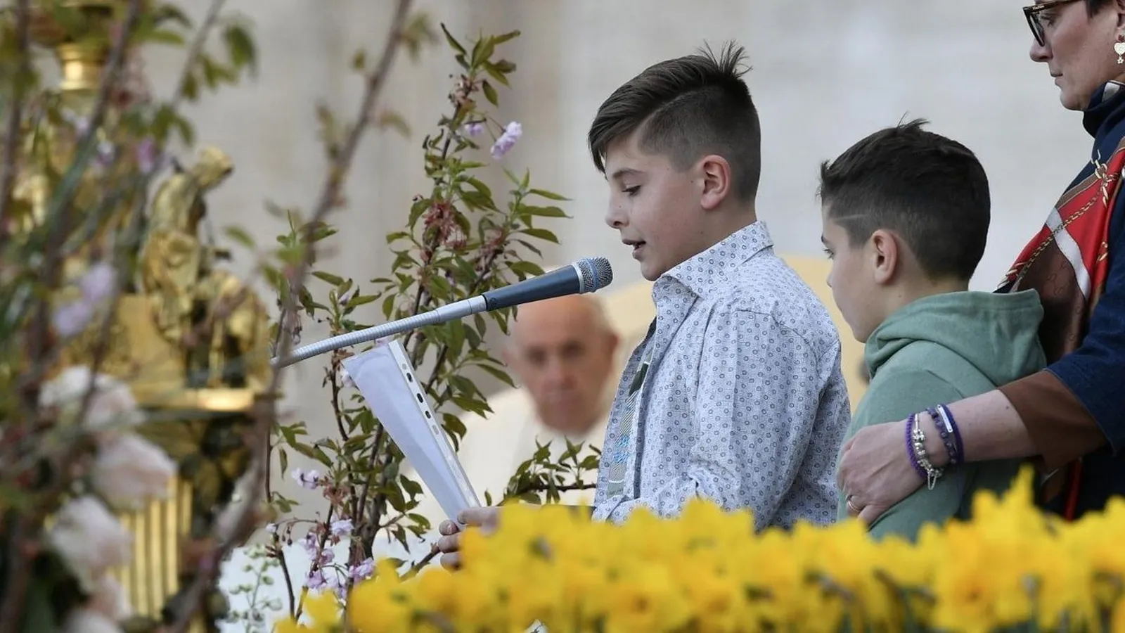Mattia recordó cuando todos se reunían en la iglesia para encender una vela "confiando en que nuestras peticiones serían atendidas o lo feliz que era mi padre cuando cantaba con el coro de la parroquia". Una historia que, con la inmediatez de una experiencia intensamente vivida, llegó al corazón de quienes la escucharon. Con pocas palabras, en pocos minutos, el pequeño Mattia ofreció un gran don: dio testimonio de que el amor de un hijo, la unidad de una familia, la solidaridad de una comunidad de fe pueden ayudar a resistir toda prueba.