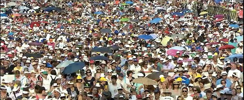 Francisco escuchó dos vibrantes testimonios, de un anciano y su mujer, quien durante años ejerció como juez en la lucha contra la Mafia italiana, y que sufrió la muerte, el secuestro y "la sangre de inocentes" durante décadas; y de un joven que conoció a la Renovación Carismática tras muchos problemas. El ambiente ayudaba: sol y lluvia intermitentes. Aunque cuando el Papa comenzó a hablar, cayó a cántaros.