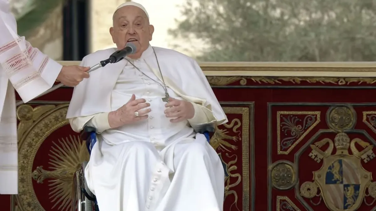 Y apareció. Lo preanunciaba también la presencia del pendón con el escudo pontificio en la fachada de la basílica de San Pedro y la presencia de miembros de la Guardia Suiza apostados por todo el contorno de la icónica plaza vaticana. Salió por un lateral de la basílica, guiado en su silla de ruedas por su enfermero, quien le llevó hasta el altar, donde, tras saludar al cardenal Sandri, quien unos instantes antes había presidido la misa del Domingo de Ramos, pronunció, en voz todavía ronca, un breve saludo.