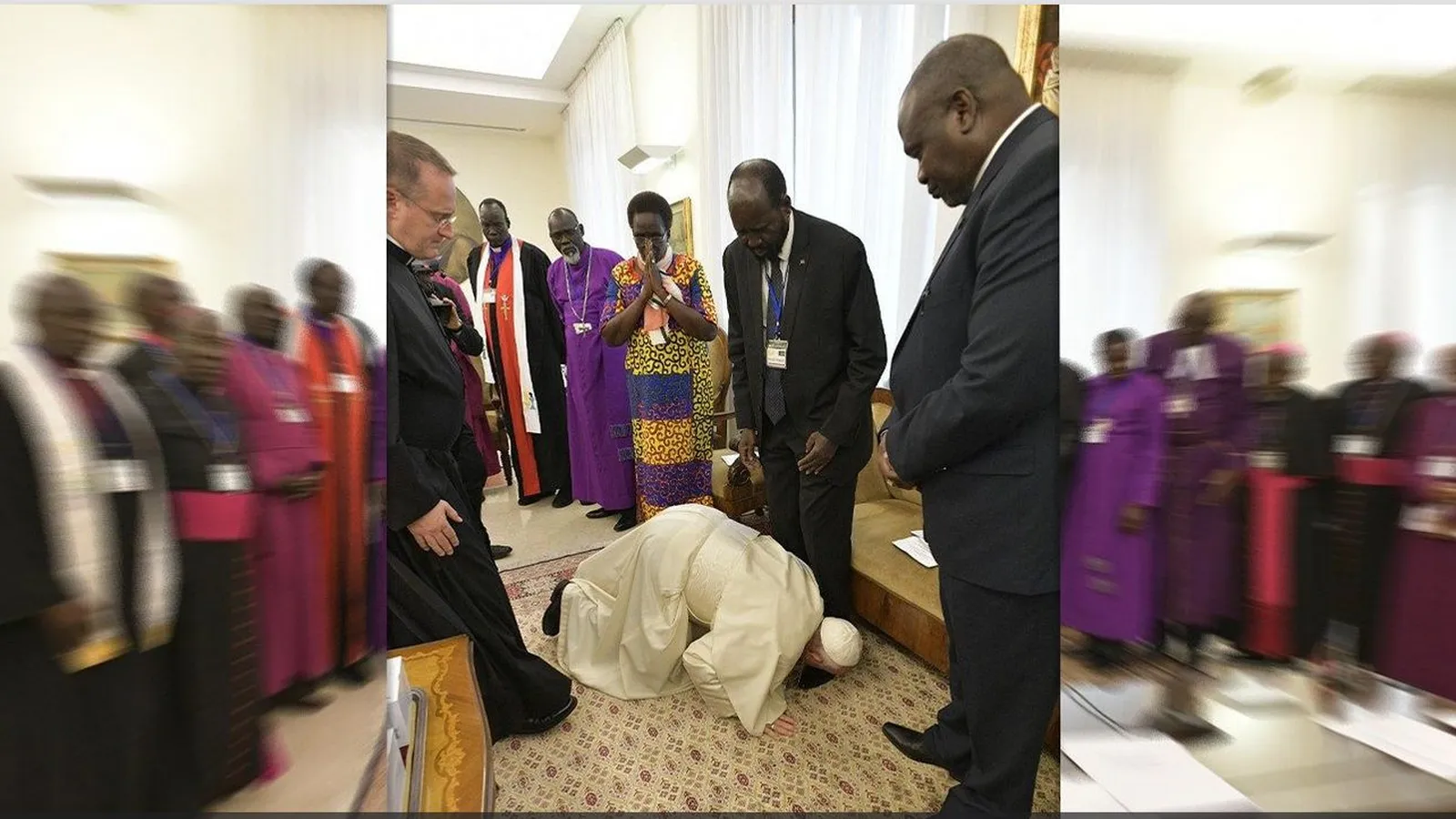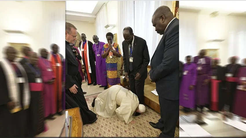 Ayer, 11 de abril al final del retiro espiritual de los líderes políticos de Sudán del Sur en Domus Sanctae Marthae, el Papa Francisco se arrodilló ante ellos para lanzar un llamamiento por el futuro que comenzará el 12 de mayo. Francisco besó los pies del presidente de la República, Salva Kiir Mayardit, y los vicepresidentes designados, entre ellos Riek Machar y Rebecca Nyandeng De Mabior.