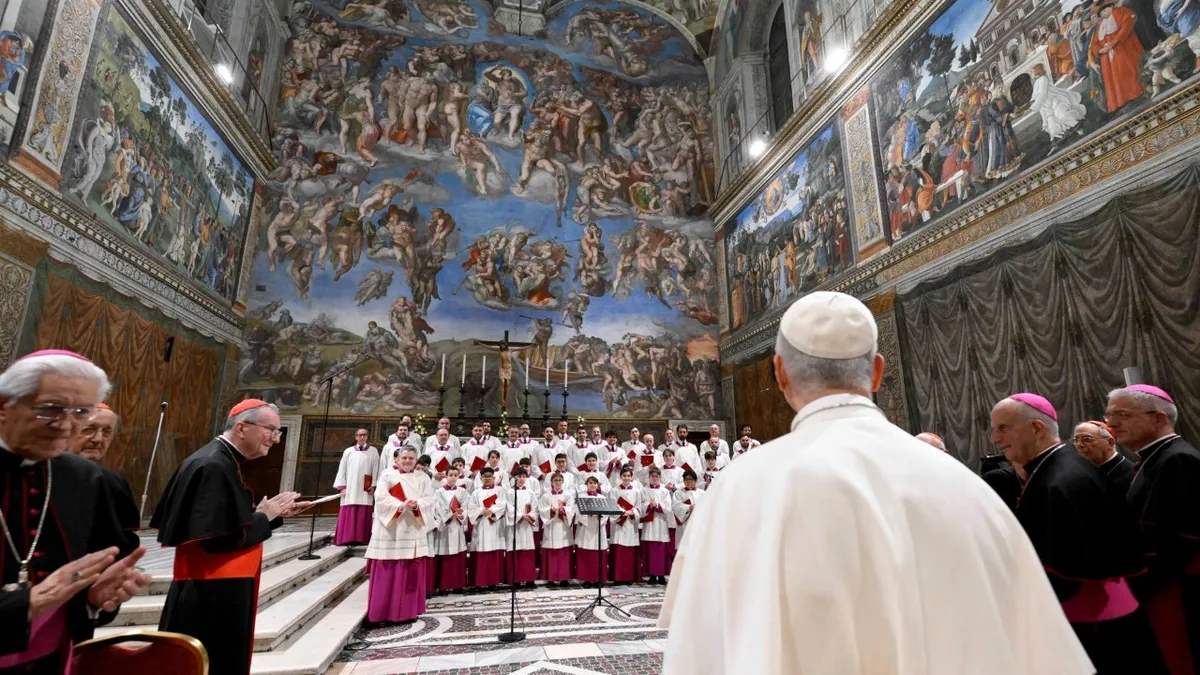 En su alocución, el Santo Padre expresó su gratitud a los miembros de la Capilla Sixtina, en particular al maestro director Mons. Marcos Pavan y al maestro de los Pueri, Michele Marinelli, por su dedicación. Actualmente, el coro está compuesto por 24 cantantes adultos y unos 30 cantantes infantiles, los Pueri Cantores, que constituyen la sección de voces blancas. La Capilla forma parte de la Oficina de Celebraciones Litúrgicas del Sumo Pontífice como lugar específico de servicio a las funciones litúrgicas papales, y su responsable es el Maestro de Celebraciones Litúrgicas Pontificias.
