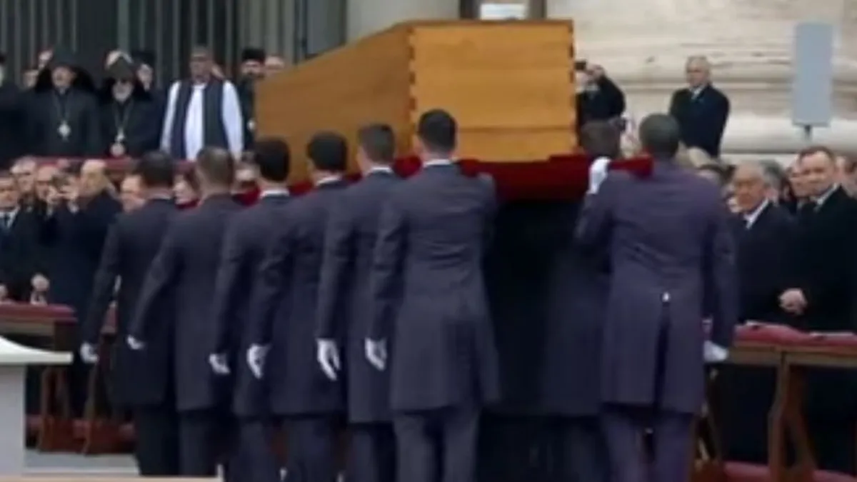 Antes de entrar en la basílica, el papa Francisco que presidió el funeral se detuvo de pie algunos minutos delante del féretro y puso su mano sobre él.