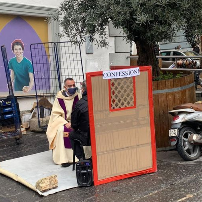 El padre Michele Madona, párroco de Santa María de Montesanto, no esperó más el fin de la pandemia y se hizo a las calles con su confesionario 'ambulante' en Nápoles, Italia