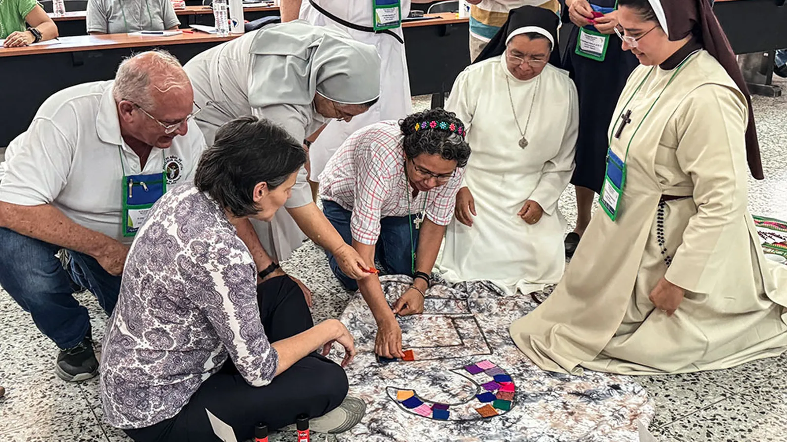 En la misa de apertura de la reunión del 18 al 21 de abril, los miembros de la CLAR colocaron dos pedazos de tela, que representaban a Nicaragua y Haití, delante del altar. Religiosas y religiosos pusieron encima sus anillos, crucifijos, unas flores y otros objetos personales como muestra de solidaridad con la vida religiosa en esos países.