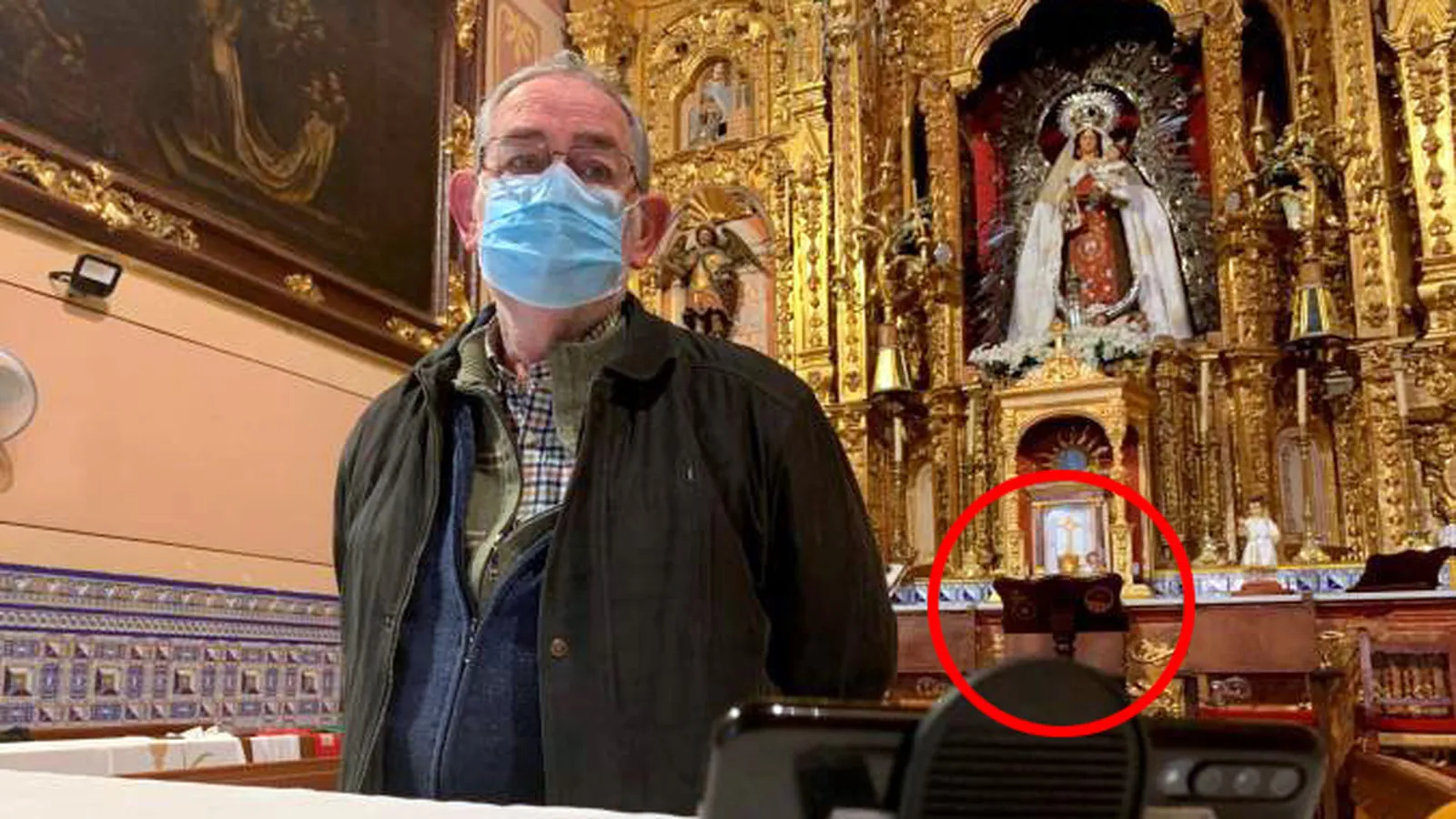 García recibe a Efe en el altar de su parroquia, ante un retablo que preside la Virgen del Carmen, una pequeña imagen de la representación que da nombre a su parroquia, y con un pequeño soporte que coloca para poner el móvil y así quién quiera puede seguir las misas en su teléfono o su ordenador.