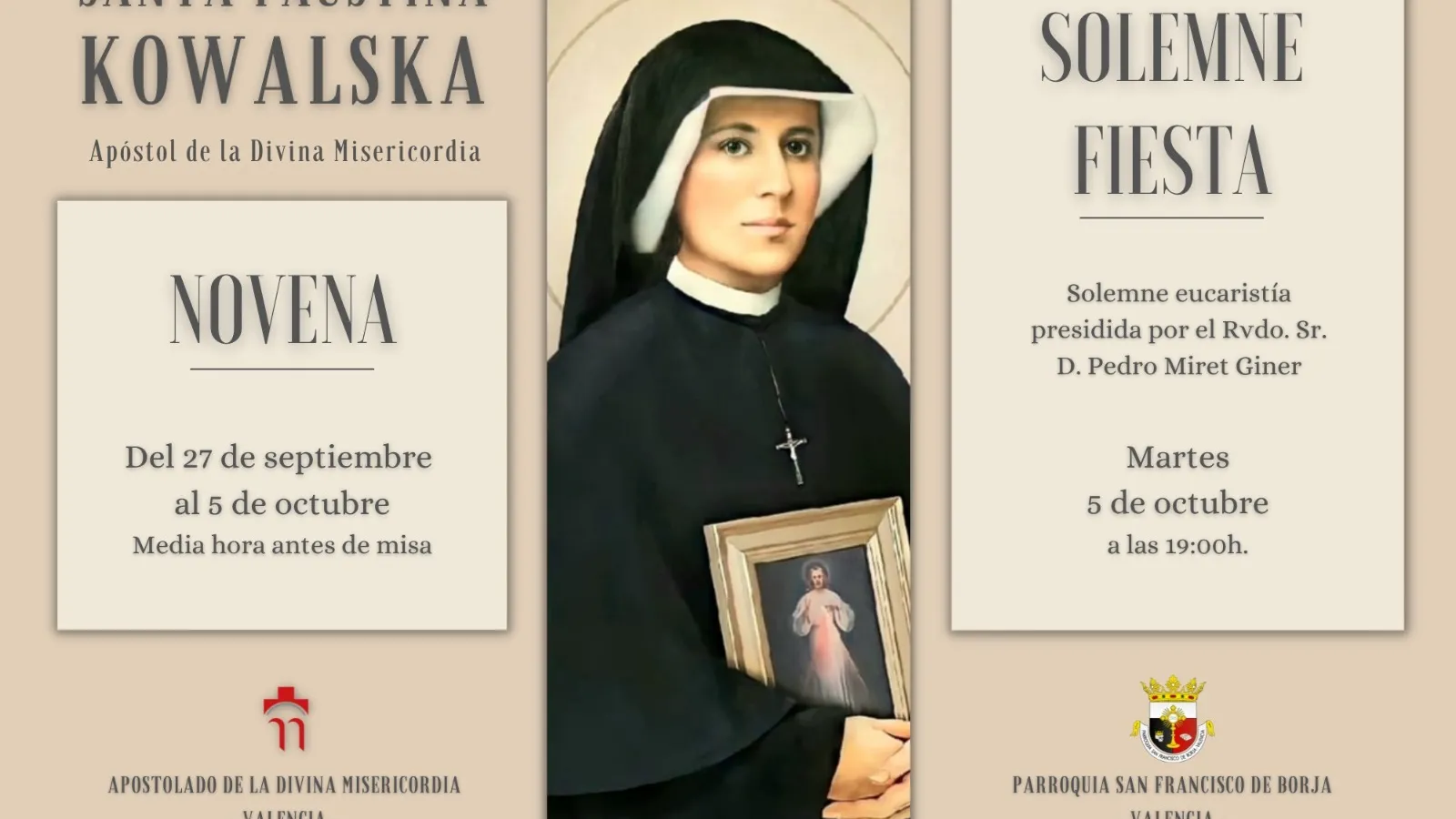 La Asociación Apostolado de la Divina Misericordia de Valencia, tiene previsto celebrar la Novena y la Fiesta en honor a Santa Faustina Kowalska que tendrán lugar en la parroquia San Francisco de Borja de Valencia, sede de nuestra asociación.
