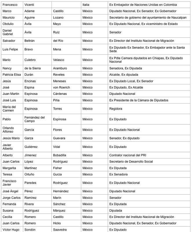 Entre los firmantes, se encuentran connotados dirigentes políticos como el Ex Presidente de la Cámara de Diputados de España y excandidato presidencial del Partido Socialista Obrero Español José Bono; o el Ex Presidente de Costa Rica y Ex Secretario General de la OEA Miguel Ángel Rodríguez Echeverria del Partido Unidad Social Cristiana; o el Ex Presidente de la Cámara de Diputados de Argentina, el justicialista Julián Domínguez; o la Ex Canciller de Chile y ex candidata presidencial Soledad Alvear de la Democracia Cristiana; o los ex directores del Instituto Nacional de Migración de México Cecilia Romero y Salvador Beltrán.